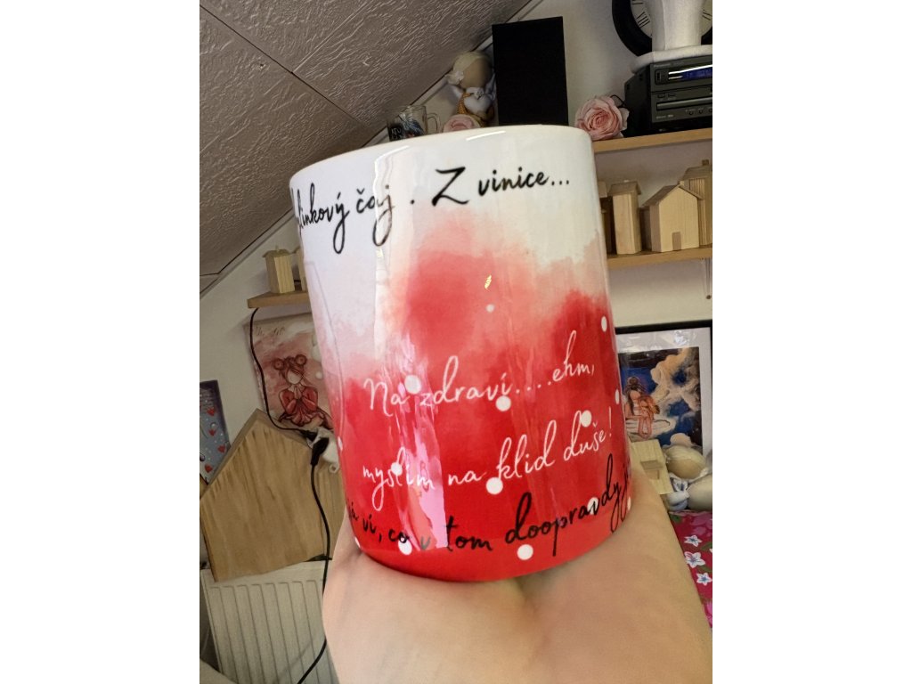 S jemným červenobílým designem a nápisem „Dneska jen bylinkový čaj… Na zdraví… ehm, myslím na klid duše!“ ti každý den vykouzlí úsměv na tváři. Hrnek je ideální pro všechny, kdo milují klid, pohodu a malé okamžiky radosti.