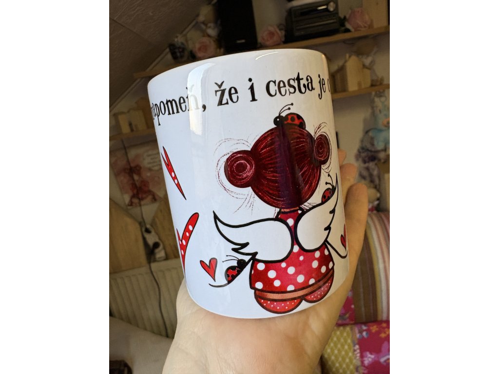 Motivační hrnek s autorskou ilustrací andělské holčičky a poselstvím „Cesta je cíl“. Krásný dárek, který připomíná zpomalit a radovat se z každého kroku.
