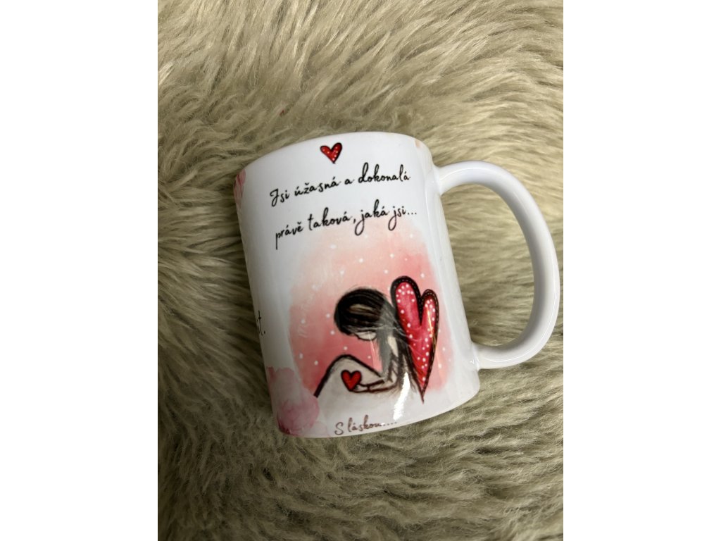 Něžný hrnek s autorskou ilustrací a krásným poselstvím „Jsi úžasná a dokonalá právě taková, jaká jsi…“. Ideální dárek, který připomene ženě, jak moc je výjimečná.