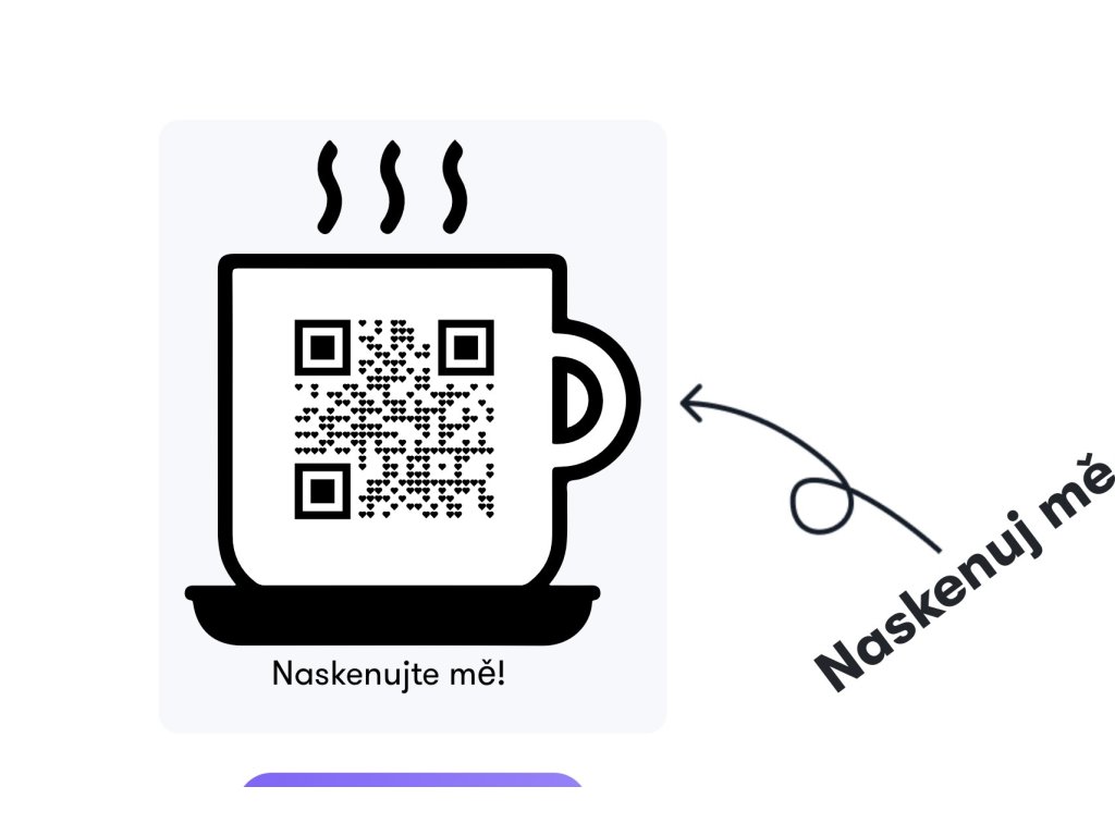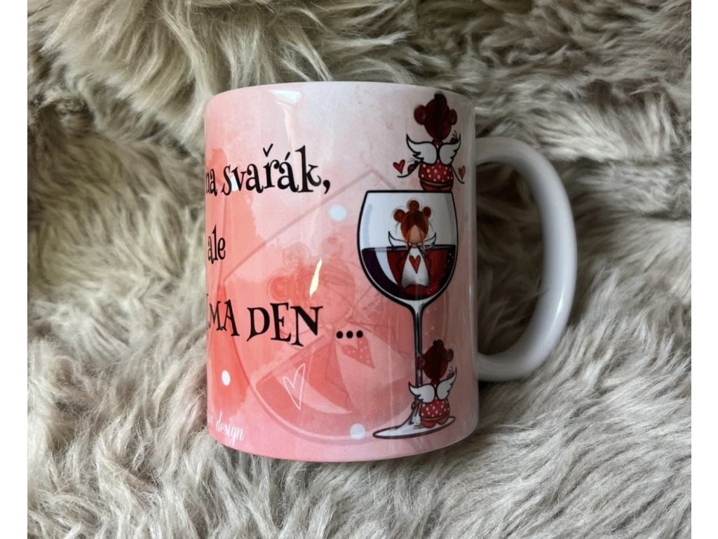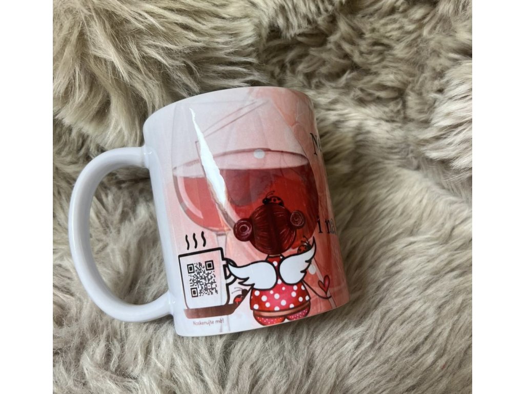 Hrnek s malými andělkami a qr kódem, kdy po jeho načtení se dostanete na speciální stránku s autorskou písní...