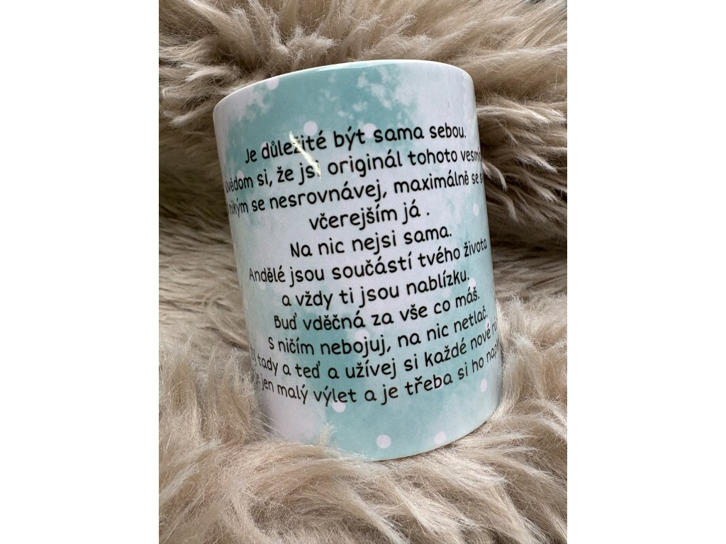 Na druhé straně hrnku je delší motivační text, který tě vede zpět k sobě: