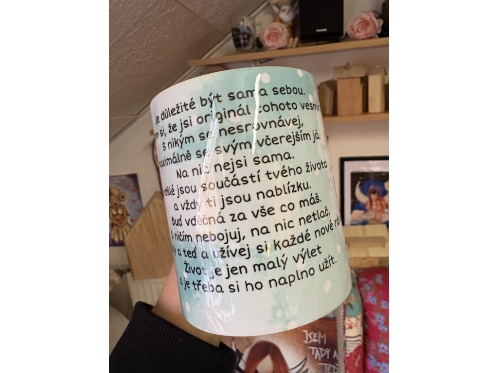 Nápis „Je důležité být sama sebou…“ připomíná, že není třeba se srovnávat, ale vnímat vlastní hodnotu a radovat se z každého dne. Hrnek se svým jemným pastelovým designem působí klidně a harmonicky – ideální pro chvíle s čajem, kávou nebo pro zastavení uprostřed dne.
