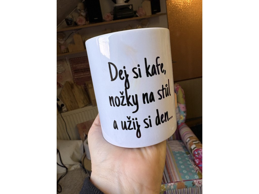 Vtipný hrnek s nápisem „Dej si kafe, nožky na stůl a užij si den…“ ti připomene, že někdy stačí zpomalit a dát si chvilku jen pro sebe. Ideální na ranní kávu i malý odpočinek během dne.