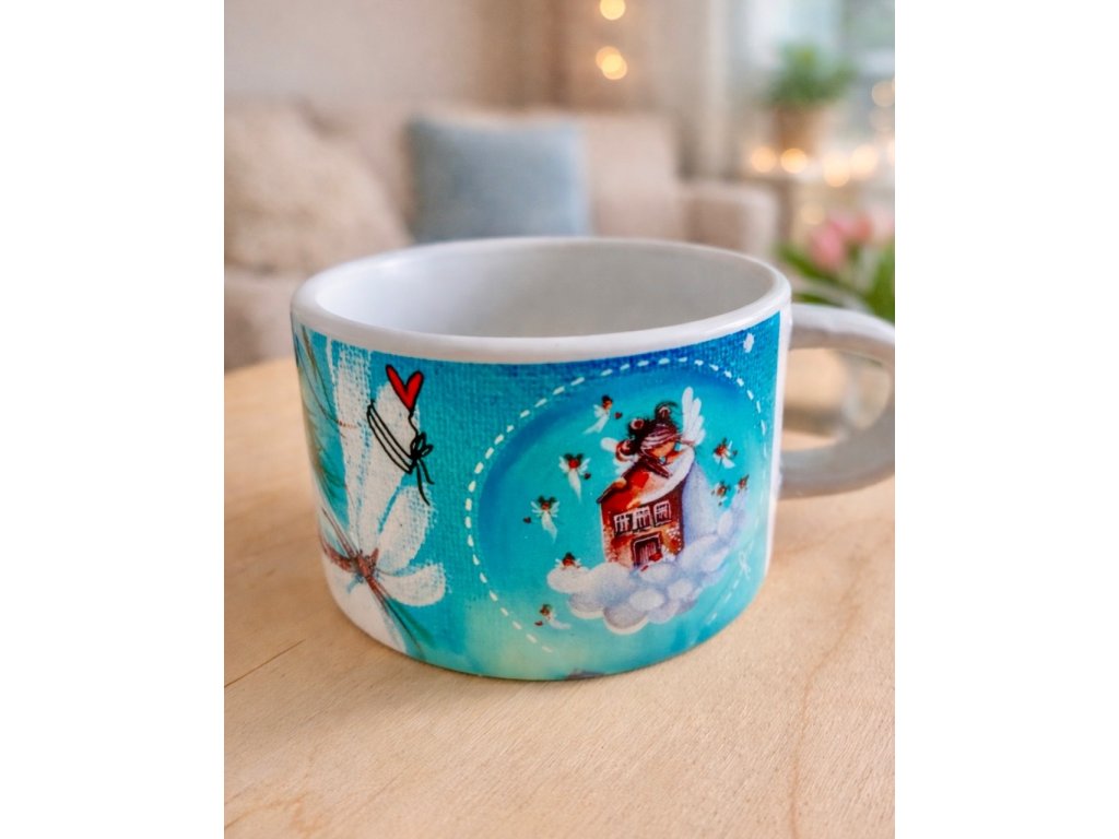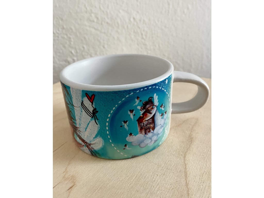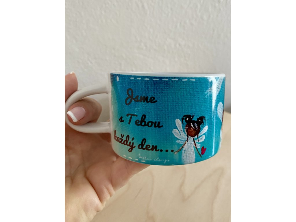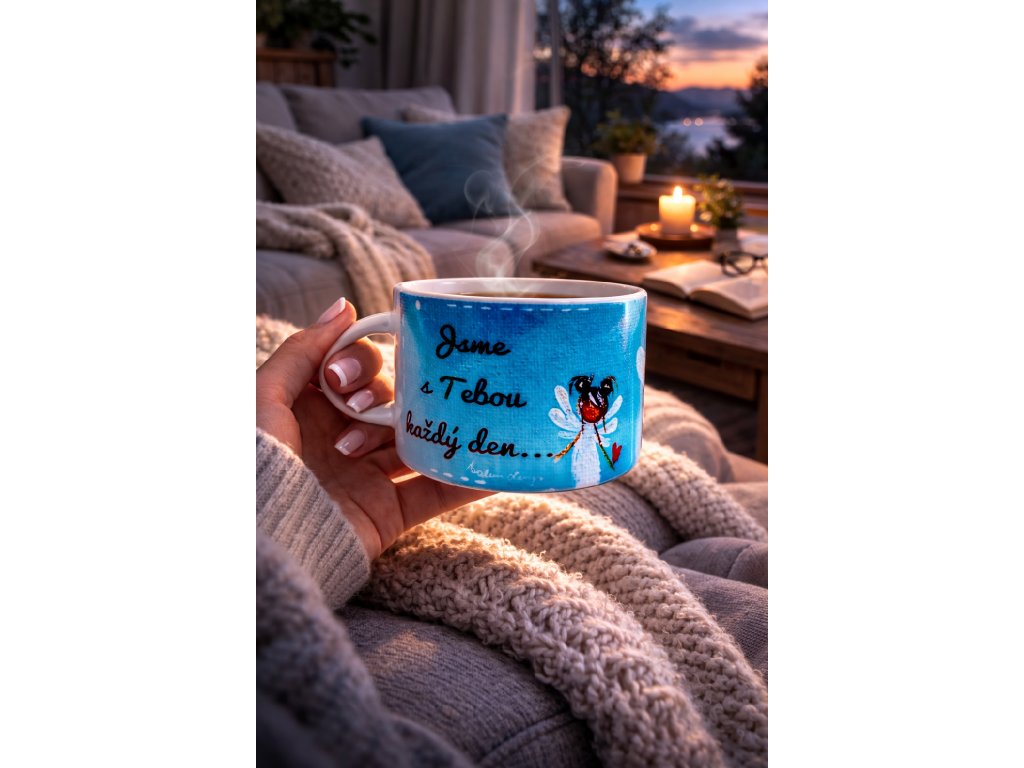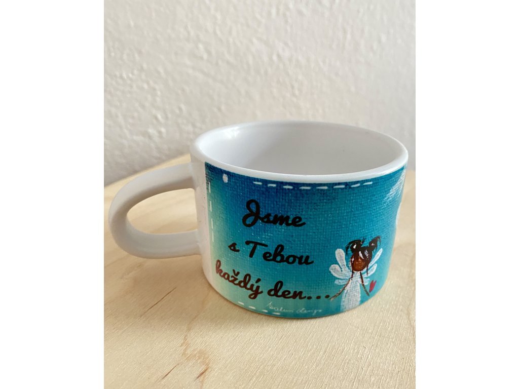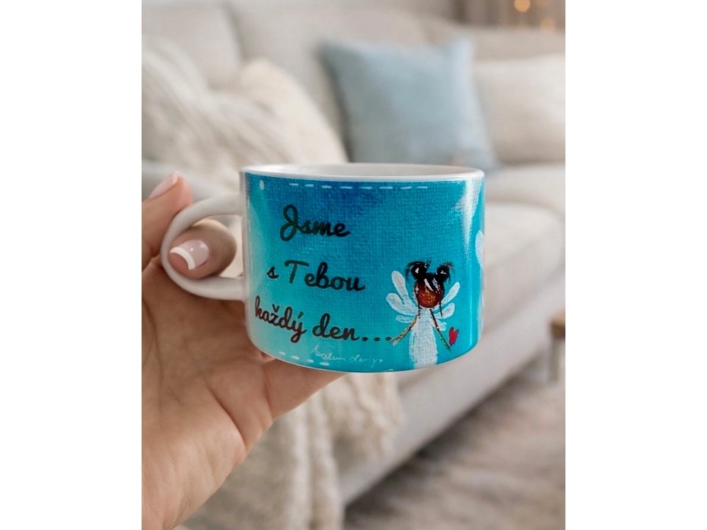 Hrnek s inspirativním textem „Jsme s tebou každý den ...“a andílkem, který ti připomíná, že nikdy nejsi sama.