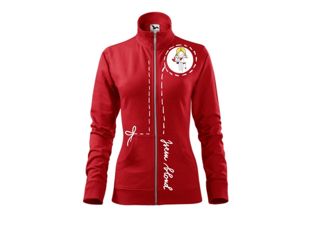 Dámská mikina na zip Malfini Viva 409 v červené barvě s autorským motivem holčičky a nápisem „Jsem blond“. Pohodlný, lehce projmutý střih, hřejivý materiál s počesanou vnitřní stranou a praktické kapsy dělají z téhle mikiny parťačku pro každý den.