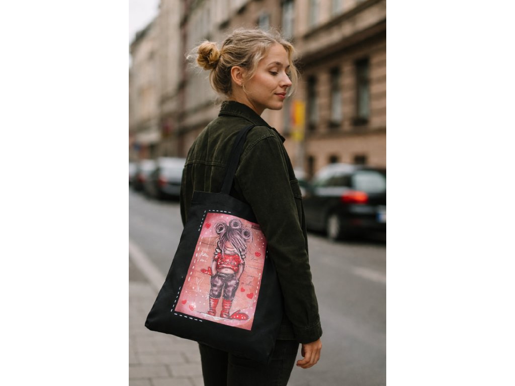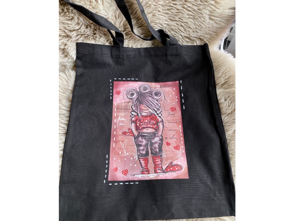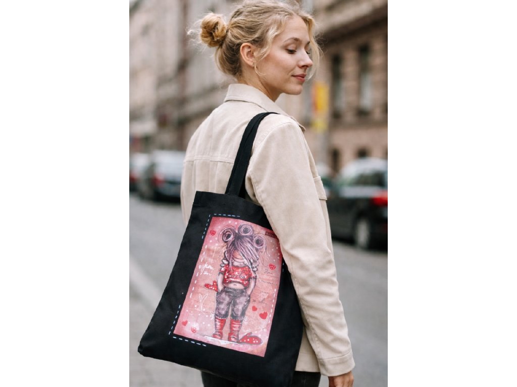 Dlouhá ucha zajistí pohodlné nošení přes rameno a černý podklad nechá vyniknout výrazné barevné ilustraci.