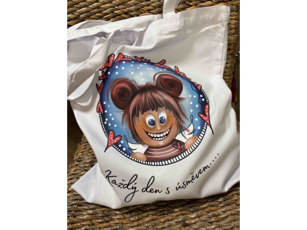 Vneste do všedních dnů trochu radosti a lehkosti s touto jedinečnou látkovou taškou, ozdobenou autorským motivem roztomilé andělky s rozcuchanými drdůlky. Její široký úsměv ti připomene, že i ten nejnáročnější den může být krásnější – stačí malý úsměv na začátek.