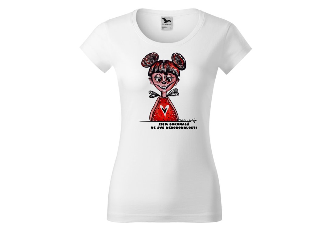 Tričko s originální ilustrací a textem „Jsem dokonalá ve své nedokonalosti“. Pro ženy, které se učí mít se rády přesně takové, jaké jsou.
