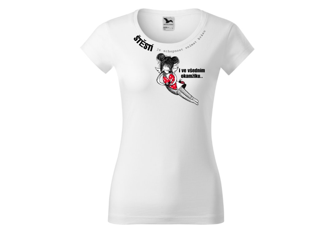 Dámské tričko s andělskou postavičkou a textem „Štěstí je schopnost vnímat krásu i ve všedním okamžiku“. Jemná připomínka všedních zázraků.
